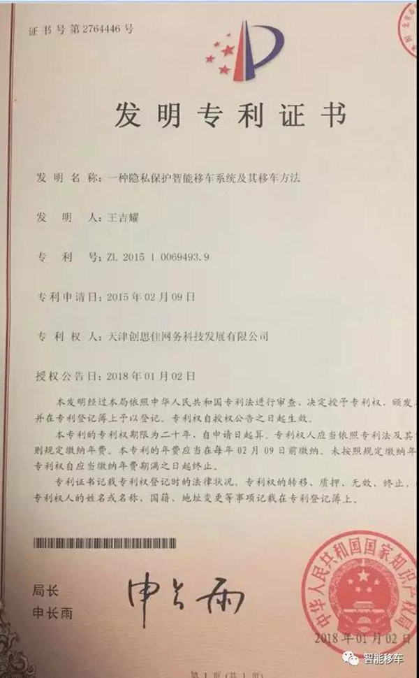 祝賀:智能移車申請(qǐng)的發(fā)明專利獲國(guó)家知識(shí)產(chǎn)權(quán)局授權(quán)